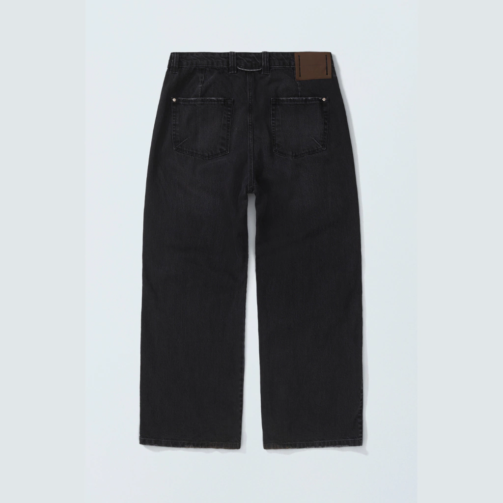 Como parte da linha Grey Label, a calça Denim é feita em jeans médio e apresenta modelagem Loose Flare. Conta com cinco bolsos, sendo três frontais e dois traseiros. A peça passa por processo de desgaste a laser, que cria marcações e contrastes visuais em todo comprimento da perna. Apresenta pregas nas laterais, criando volume diferenciado na altura dos joelhos. O Cordelete® é aplicado na parte de trás do cós como signo Quadro Creations.