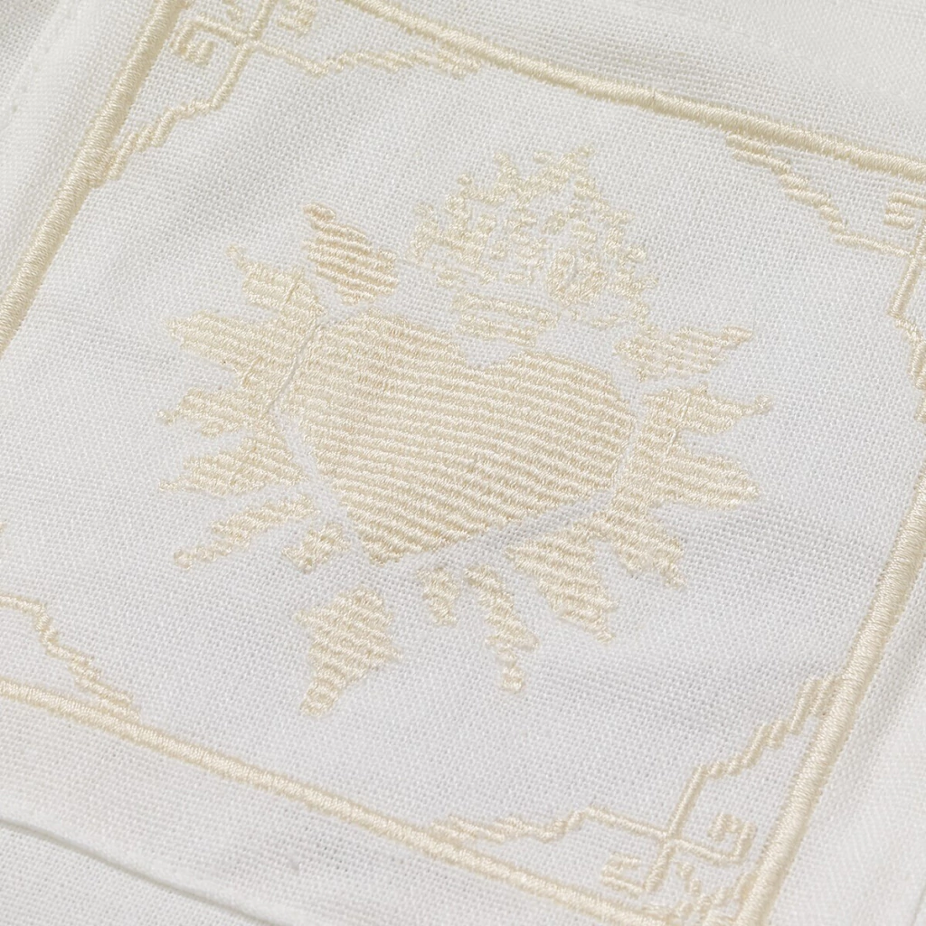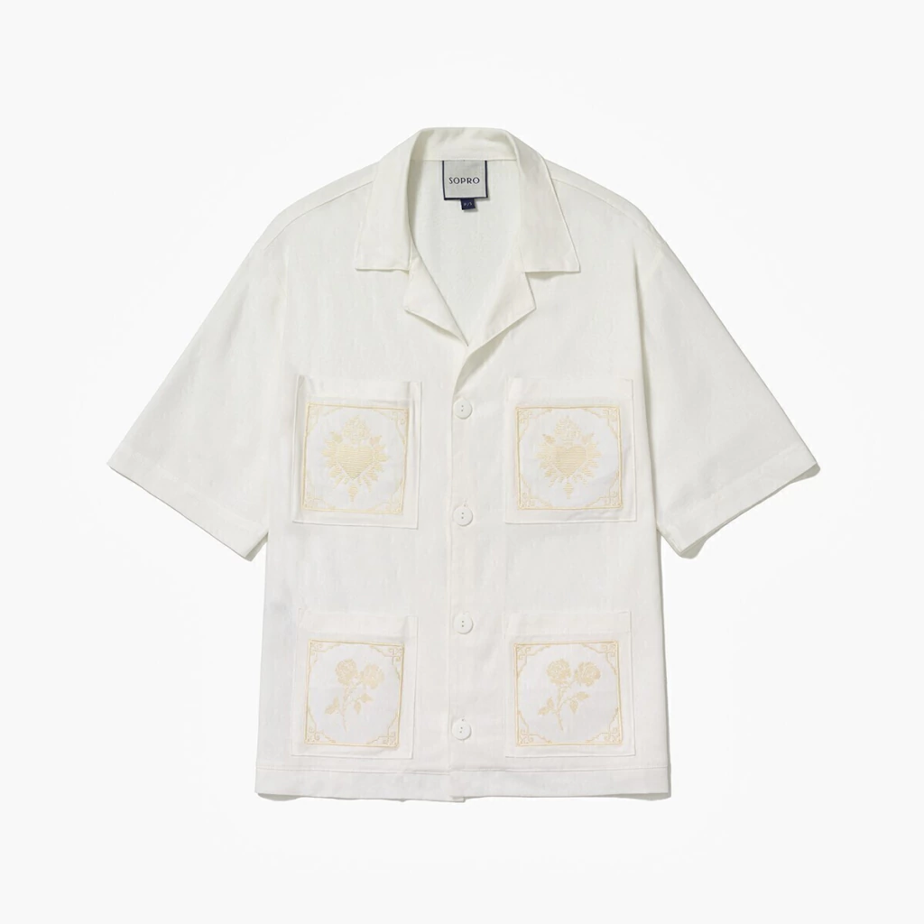 A camisa sagrado coração é uma peça que respira calor e devoção. feita em linho leve, carrega bordados que contam histórias, um coração flamejante e uma rosa, cada um emoldurado por linhas que lembram relicários. É roupa e é símbolo, leve e presente ao mesmo tempo. Com botões frontais, pode ser usada sozinha ou como sobreposição, sempre com a elegância do linho e a alma da coleção.