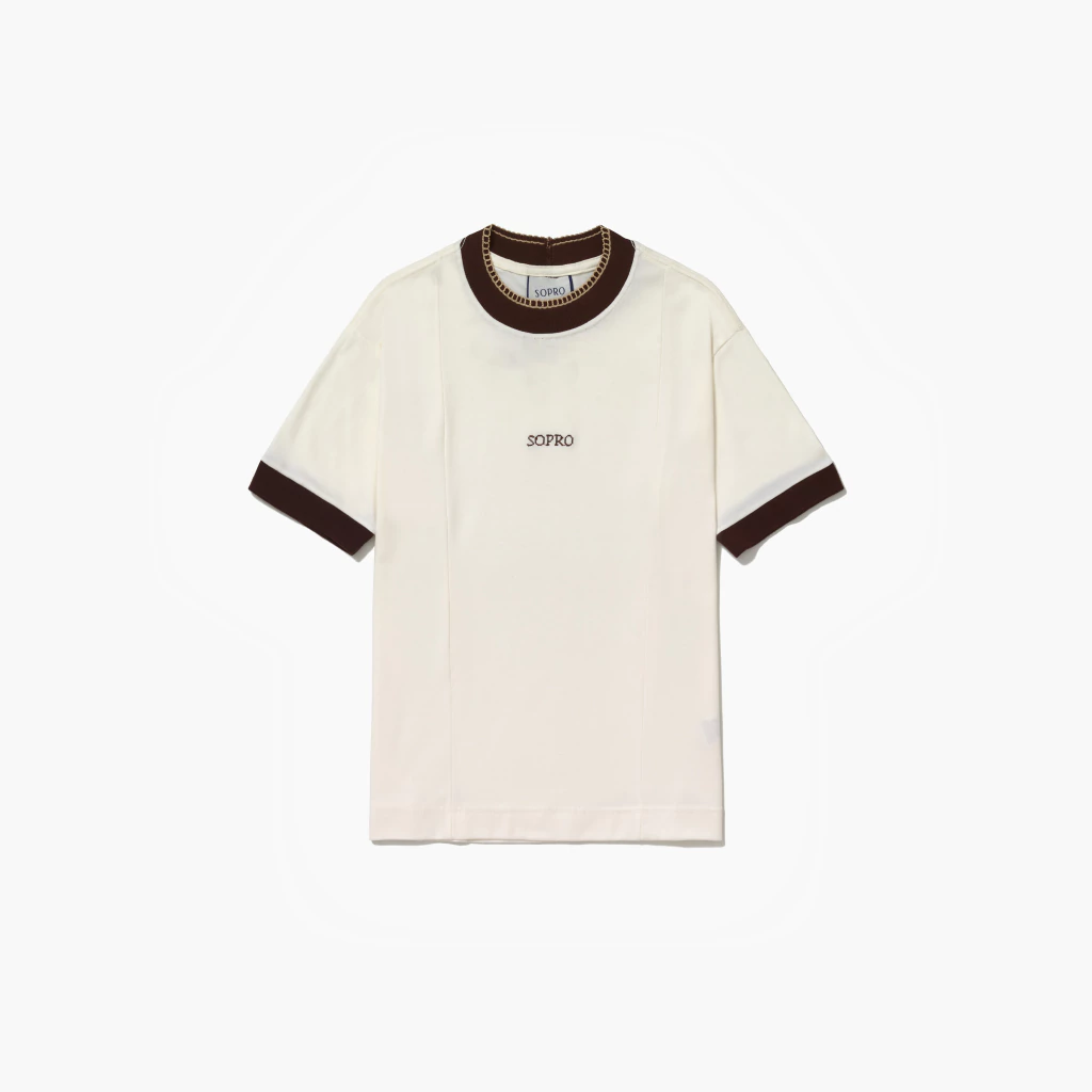 A gola e as mangas têm punho de retilínea marrom, e o detalhe contrastante da gola reforça o cuidado nos pequenos gestos.