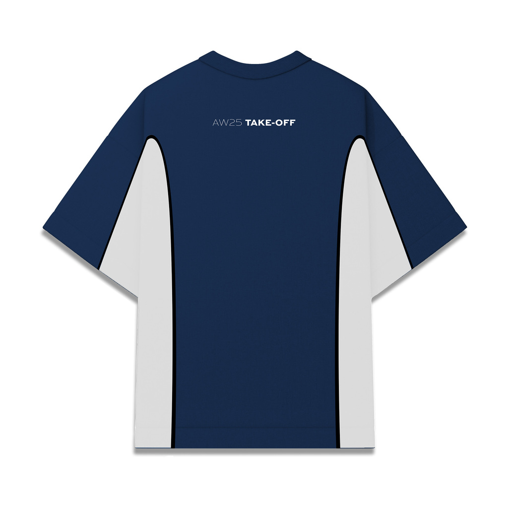 O material escolhido é um algodão de gramatura elevada que proporciona conforto e veste de forma fluída. A peça conta com linhas onduladas em relevo e junção de tecidos e cores.